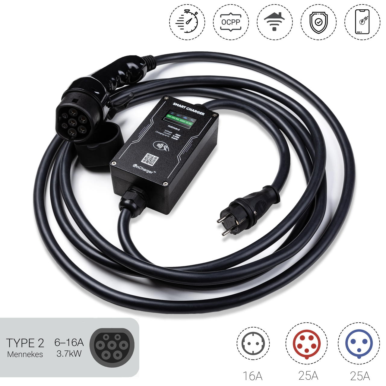 Інтелектуальний зарядний пристрій OnCharger™ має всі необхідні функції для безпечної, швидкої і комфортної підзарядки електромобіля з роз'ємом Type 2 / Mennekes. Портативний переносний пристрій відмінно підходить для використання вдома і в дорозі так як забезпечує постійний контроль температури, стану батареї, напруги в мережі живлення, наявності струму витоку для безпечної підзарядки.
